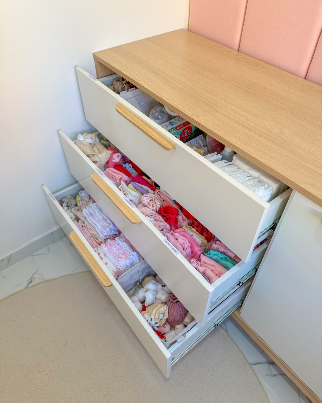 Bodies, macacões, calças, meias e paninhos devem ter lugares específicos. Essa separação facilita muito na hora de vestir o bebê, especialmente durante a madrugada. (Etiquetas ajudam ainda mais!!!)