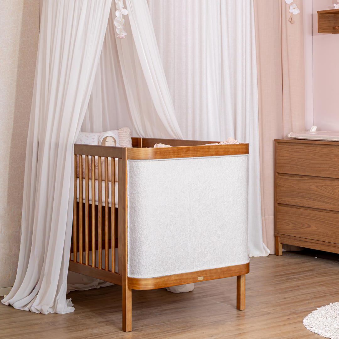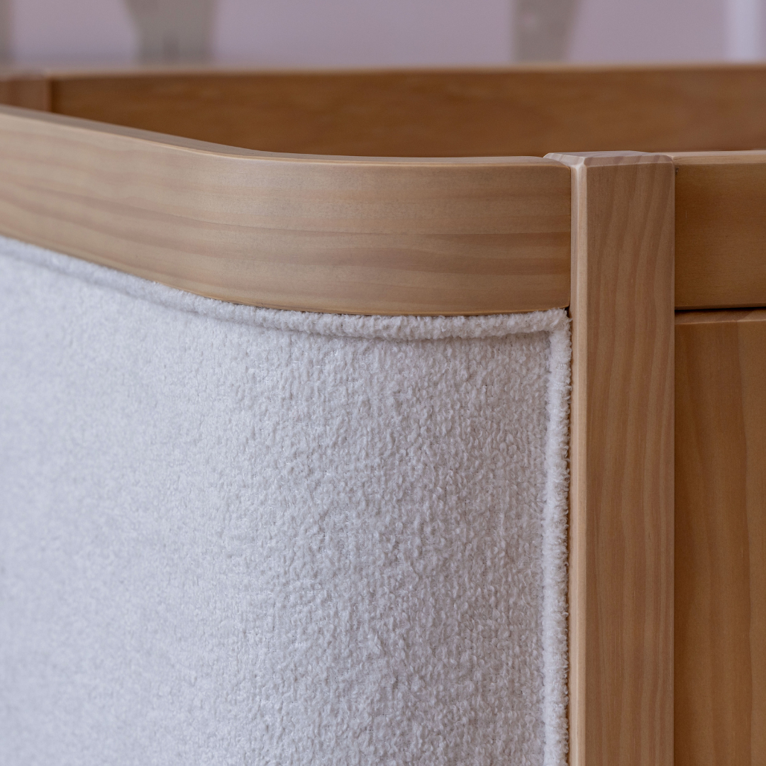 Nas cabeceiras do berço, o bouclé valoriza o design e oferece um toque macio no dia a dia.