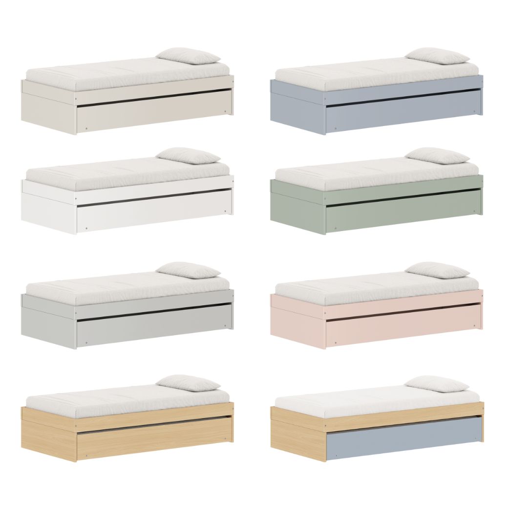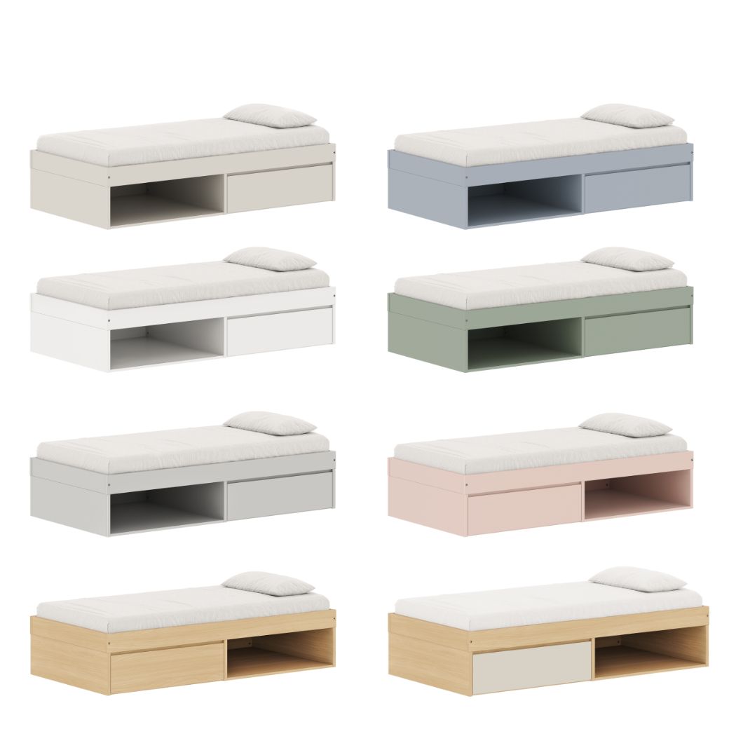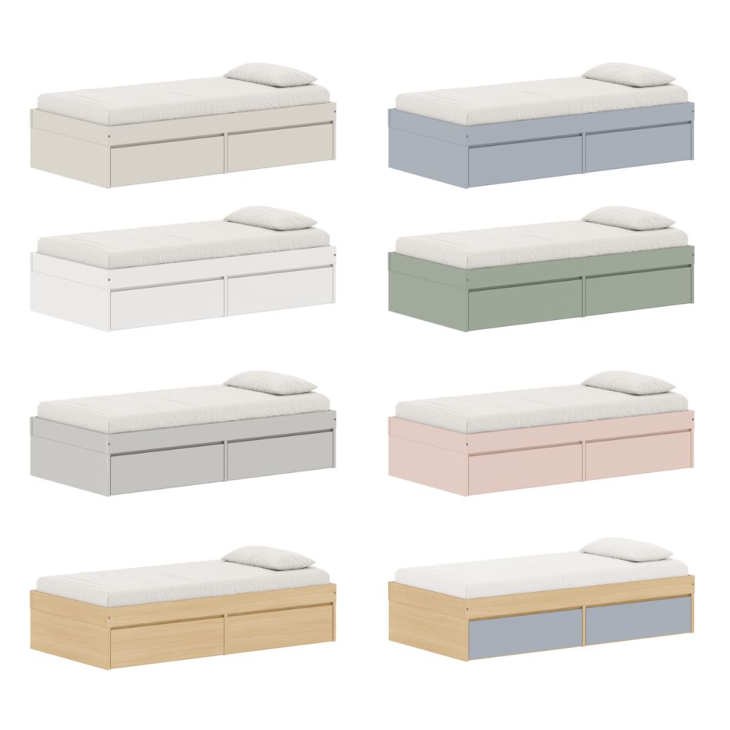 Cama com 2 gavetas a versão 1 gaveta + espaço para Futton e opção com cama auxiliar, todas tem a possibilidade de acrescentar a casinha com telhado Play ou grades laterais de proteção.